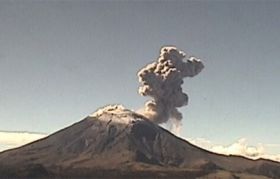 Este jueves, el volcán Popocatépetl amaneció nevado y con una fumarola de vapor de agua de 800 metros de altura, la cual se dirige al este-surest